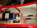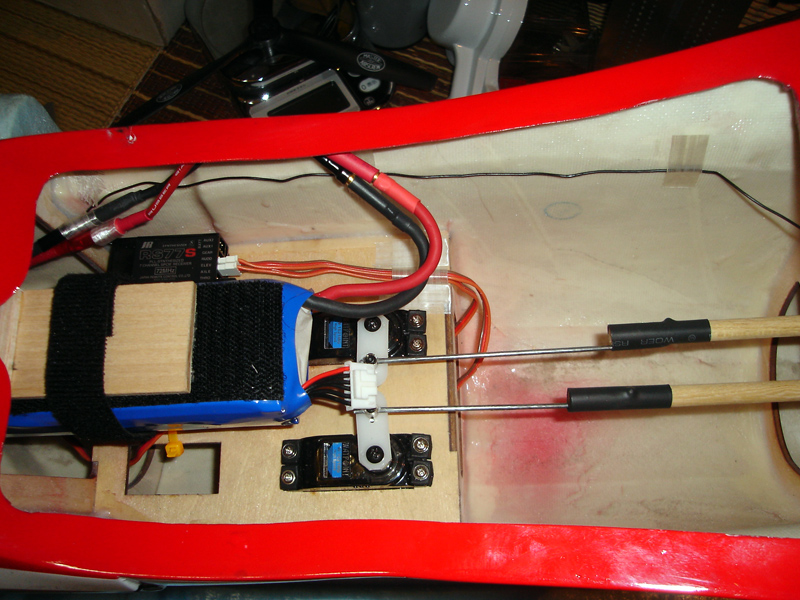 リポは防火壁いっぱいまで前に付けてべニアで簡単な台座を作りました。エンジン機でいえば、ちょうど燃料タンクのあたりになります。