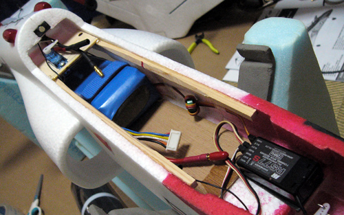 素組だと、リポの位置が後方に下げられないのでボディ内部のEPOの壁部分や主翼を固定しているべニアの骨組みも切断し、5S 4000mAhが余裕で入るように移動させました。さらに、エレベーターのマウントがリポに当たるのでマウントを作り直して底上げしました。