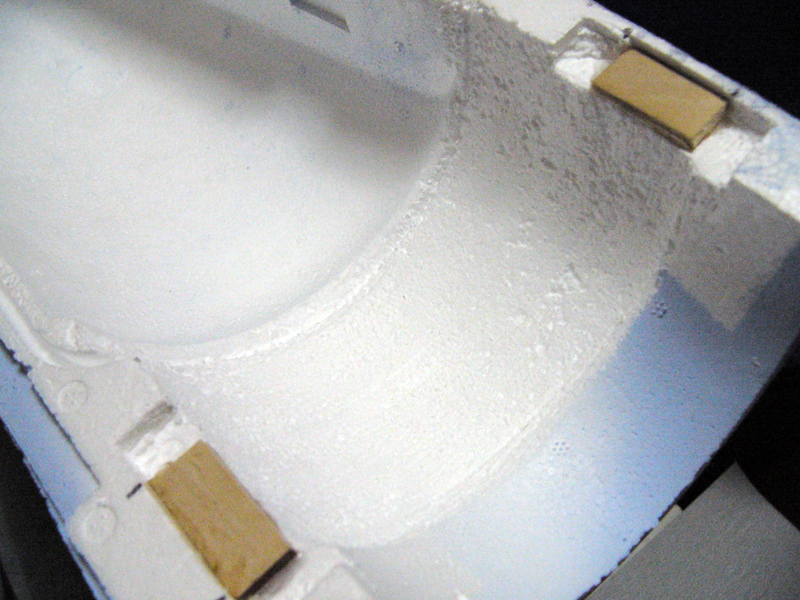 同梱のダクトは実測外径92mmでしたのでキットではそれがピッタリと納まるようになっていました。しかし、これに実装するメタルダクトは基本外径こそ92mmくらいでしたがエア吸入のファンネルが付いていたり固定のため金属バンドを使用すると94mm~ファンネル部102mmくらいとなり発泡の内側を削り落して納まるように加工しました。いやー、発泡の削りカスは始末が悪いですネ~(^^;)
